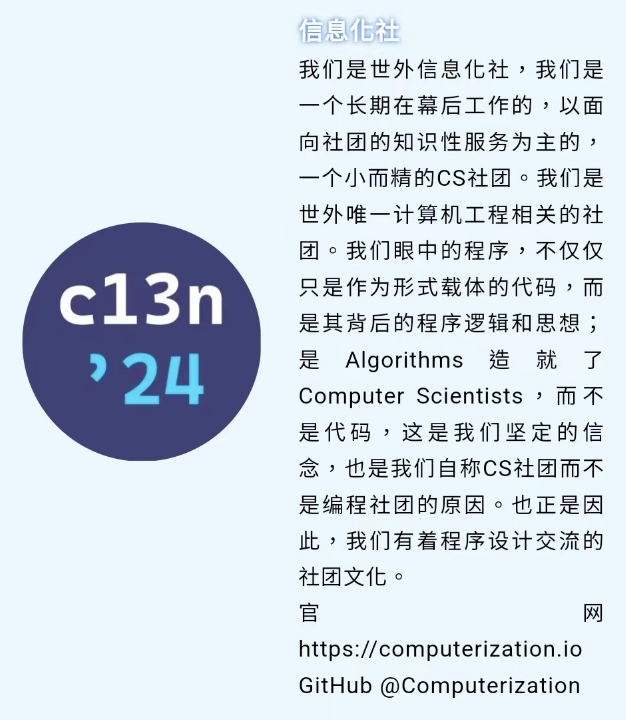 我们是一个长期在幕后工作的,以面向社团的知识性服务为主的,一个小而精的 CS 社团。我们的全称是 Computerization,世外信息化社;不过我们更喜欢被称之为 C 社。